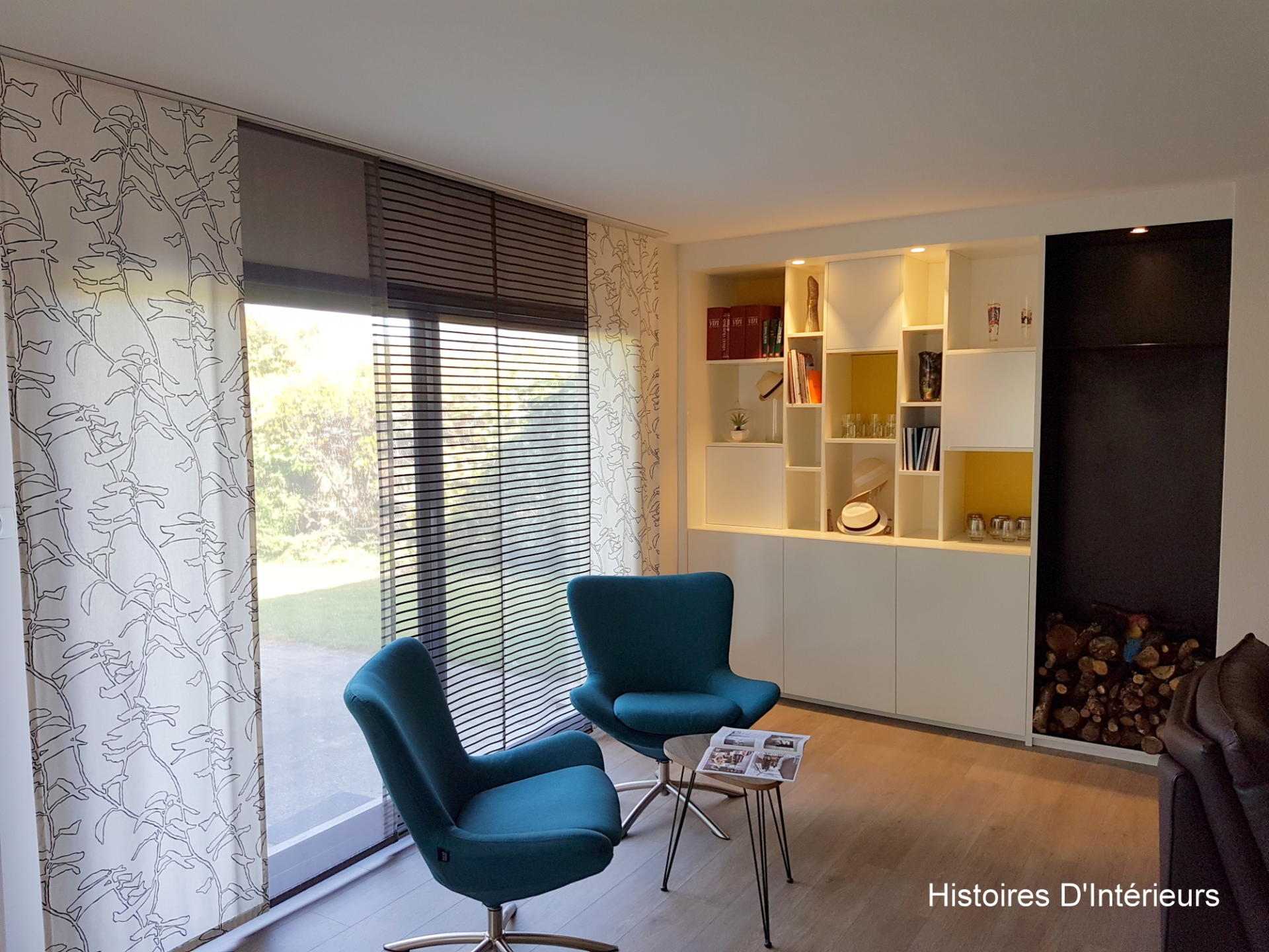 Nos clients hésitaient à conserver des meubles, nous avons finalement décidé de relooker le buffet (ton « artichaut » sur les façades et bois naturel sur le plateau). Le grand pan de mur de part et d’autre de la cheminée s’est vu habillé d’un grand agencement sur mesure incluant des rangements fermés et des niches ouvertes pour accueillir des objets décoratifs.