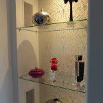 Le carrelage a été recouvert avec un nouveau plus actuel, la cheminée imposante a été remplacée par une cheminée et un agencement qui ont permis d’optimiser l’espace et d’apporter quelques touches décoratives justement dosées (jolie lampe, papier peint irisé mis en lumière avec un éclairage subtil), objets déco…